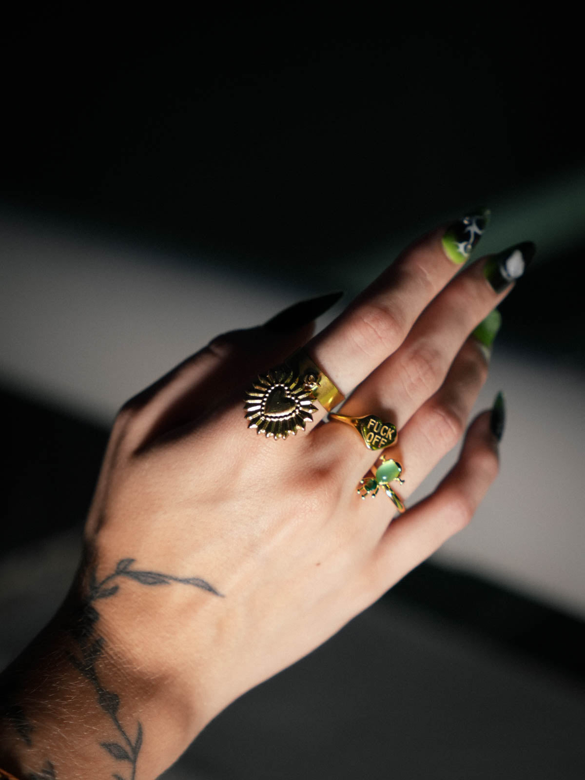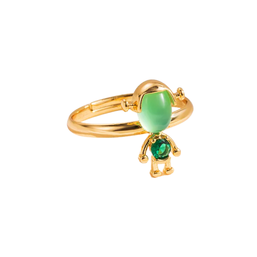 Add a playful twist to your everyday style with this dainty gold ring featuring a charming Frankenstein design adorned with green zirconia crystals. Its delicate shine and quirky character make it the perfect accessory.