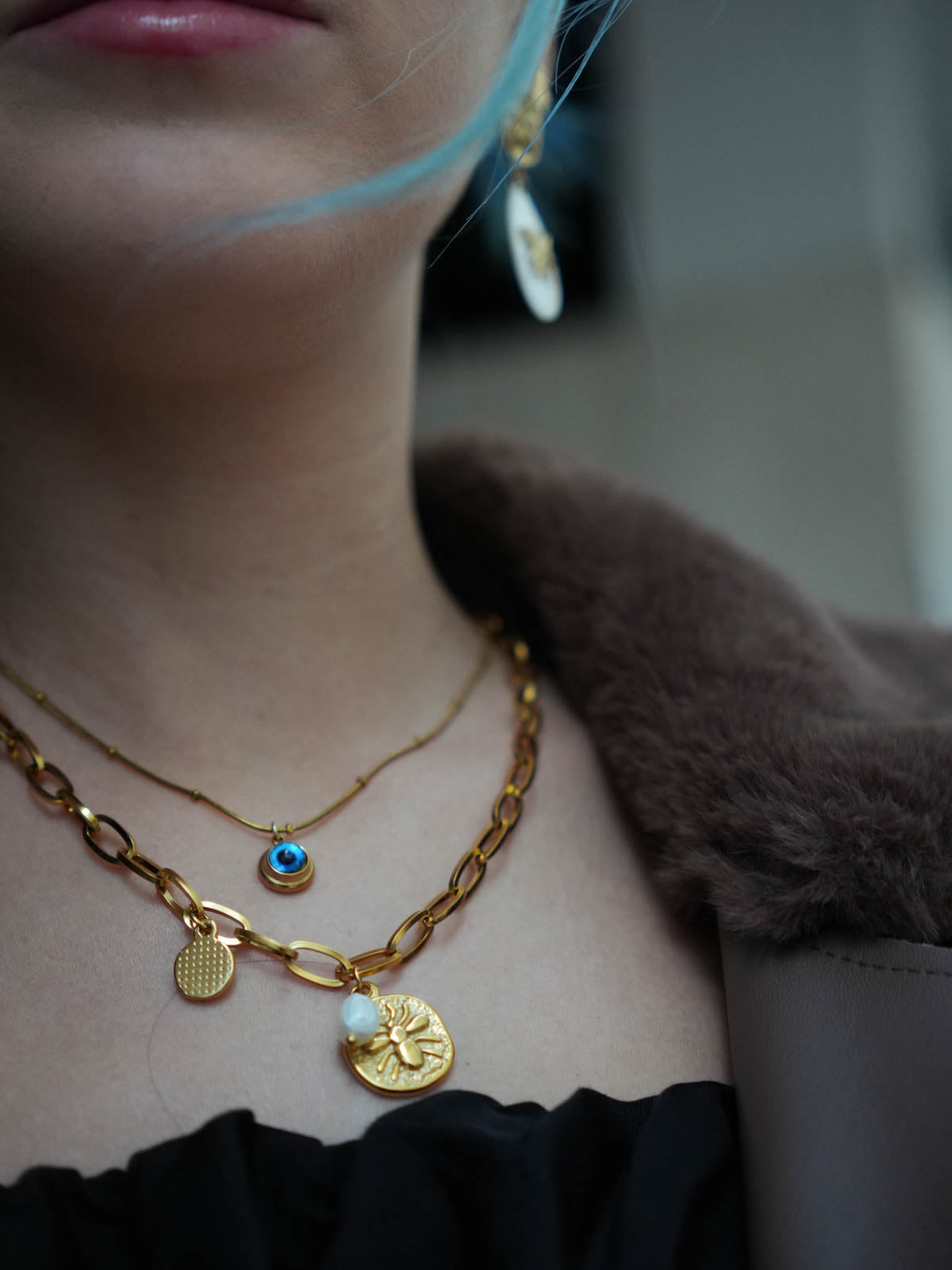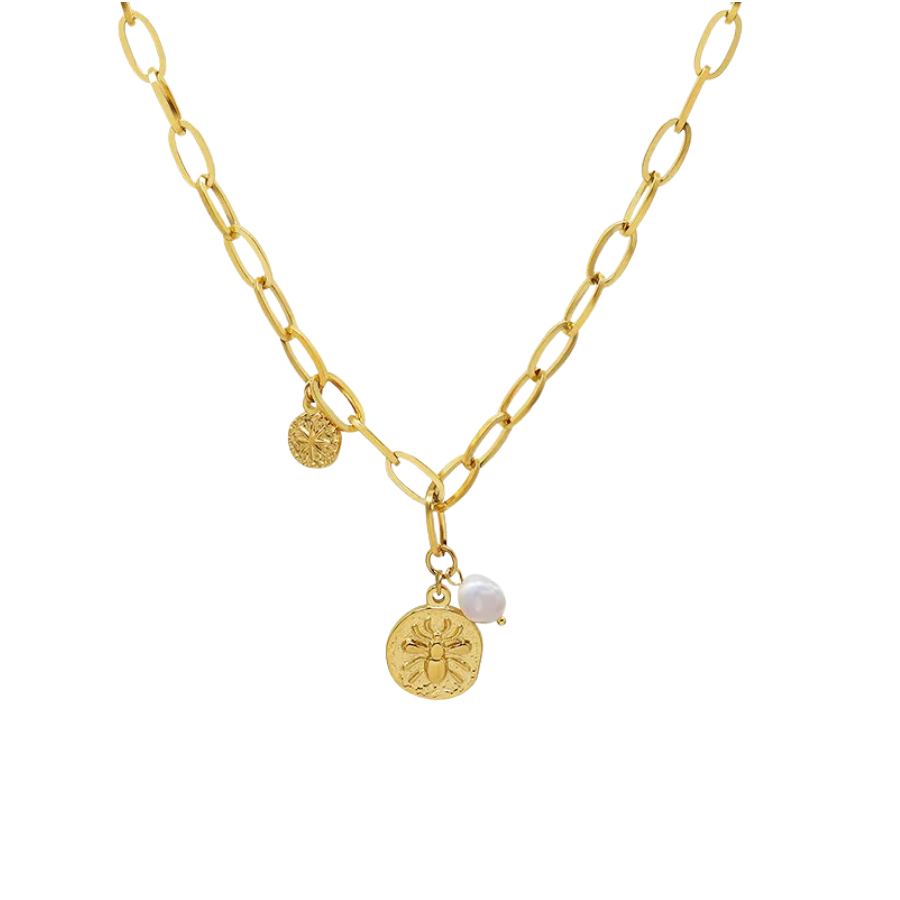 Add a touch of whimsy to your look with this delicate gold spider necklace featuring a luminous pearl charm.