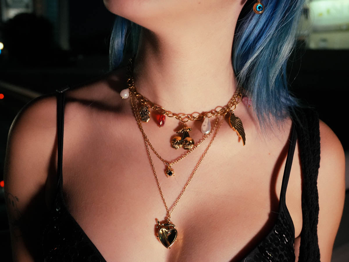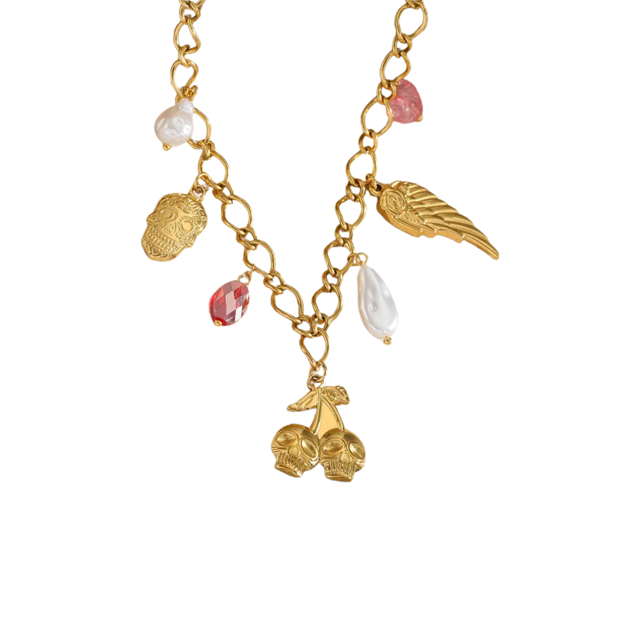 Add a playful twist to your look with the Ivy Necklace, featuring a delicate gold chain adorned with quirky skull cherry charms and whimsical touches of pink. Details: